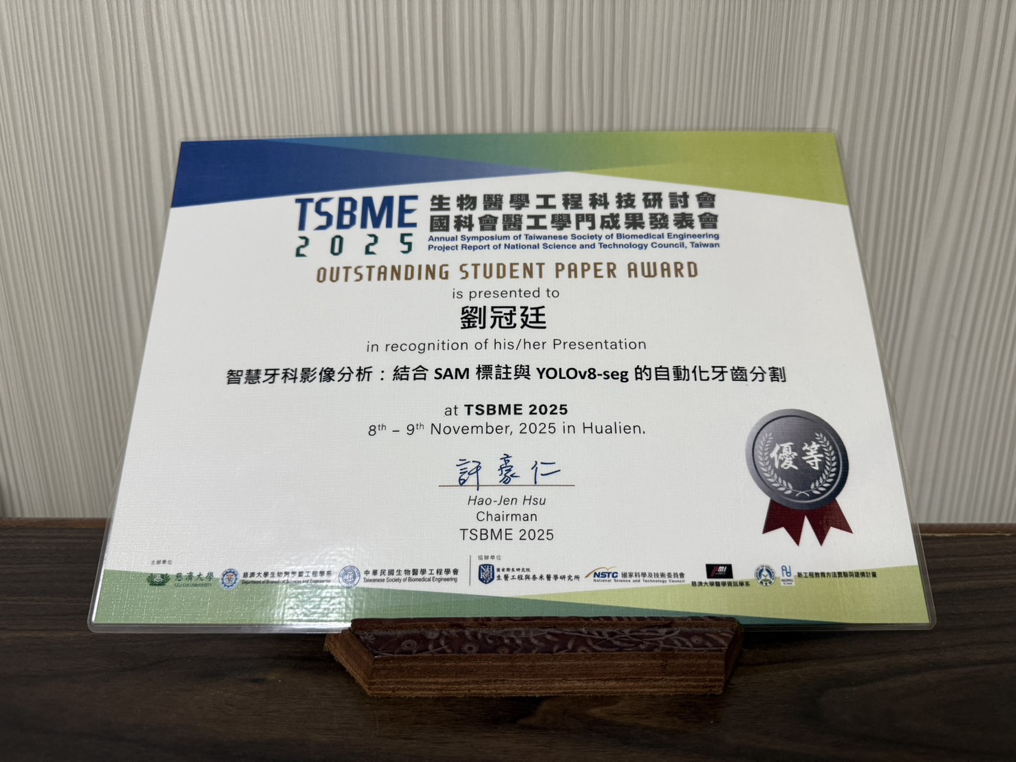 恭喜本實驗室碩士生劉冠廷榮獲2025年生物醫學工程科技研討會(TSBME 2025)學生論文競賽優等獎